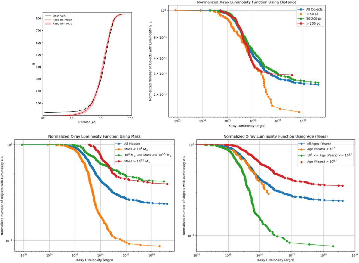 Top Left: cumulative distribution diagram for the closest star cluster to XRBs. Black represents the data, while the red line corresponds to 1000 random simulations, with the red shaded region showing the 1σ error. Top Right: normalized X-ray Luminosity Function for 3 sets of XRB-cluster distance. Bottom Left: normalized X-ray Luminosity Function for 3 sets of cluster masses. Bottom Right: normalized X-ray Luminosity Function for 3 sets of cluster ages.