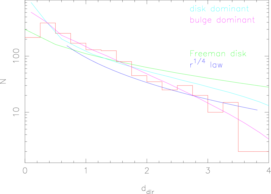 Radial distribution of SNe Ia in the Dark Energy Survey (in red). The green curve is the expectation for exponential disks and the blue curve for elliptical galaxies. These have not been normalized to the data. The other two curves are for DM triggered SNe, and these have been normalized to the same total number of SNe, excluding the first, central bin, which is anomalous, and is conceivably a selection effect of some SN being masked by the nucleus.
