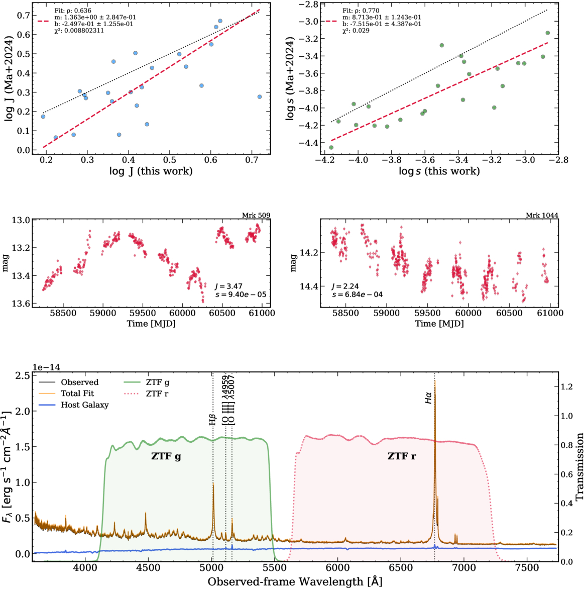 Upper left: ZTF DR24 measurements of J against those from MA24. The red line shows our fitted linear model obtained via Orthogonal distance regression (ODR), while the black line shows the 1:1 relation. Spearman correlation coefficient ρ and fitted parameters are shown in the top left corner. Upper right: same as left panel, but for s. Middle panels: representative ZTF r band light curves. Left: “Assembled” source (high J, low s). Right: “Dispersed” source (low J, high s). Each panel shows the source name, J, and s. Bottom panel: spectral fitting of Mrk 493. The black curve presents the DESI spectrum, while our best PyQSOfit is shown in orange. The derived host galaxy contribution is shown in blue. Green (solid) and red (dotted) lines show the transmission curves of ZTF for g and r, respectively. The transmission values are plotted on a secondary y-axis on the right. We marked the position of the strongest emission lines on each band with vertical dashed lines and text.